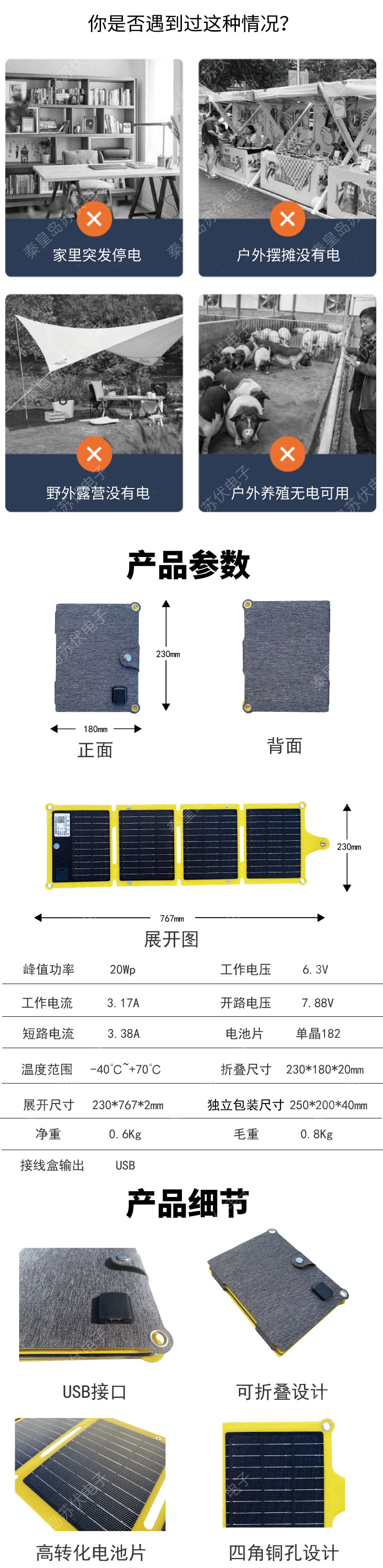單晶20W太陽能板折疊充電包戶外手機充電光伏板便攜太陽能充電器